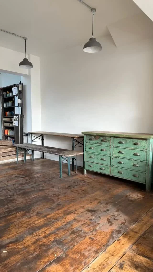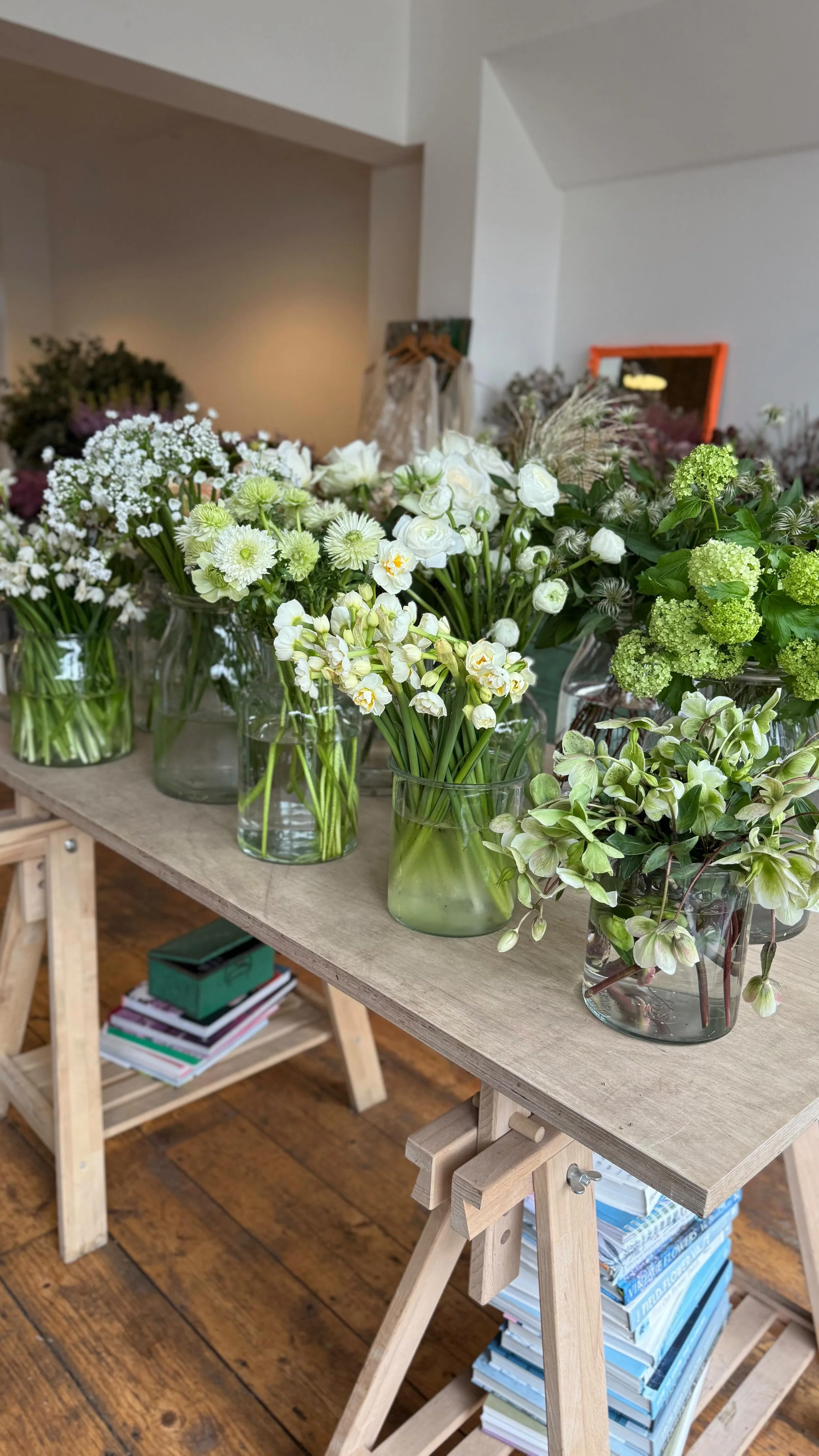Our school, with its blank white walls, exposed Bath stone, stripped wooden floors, and a large front window, creates an inspiring space for both flowers and students.