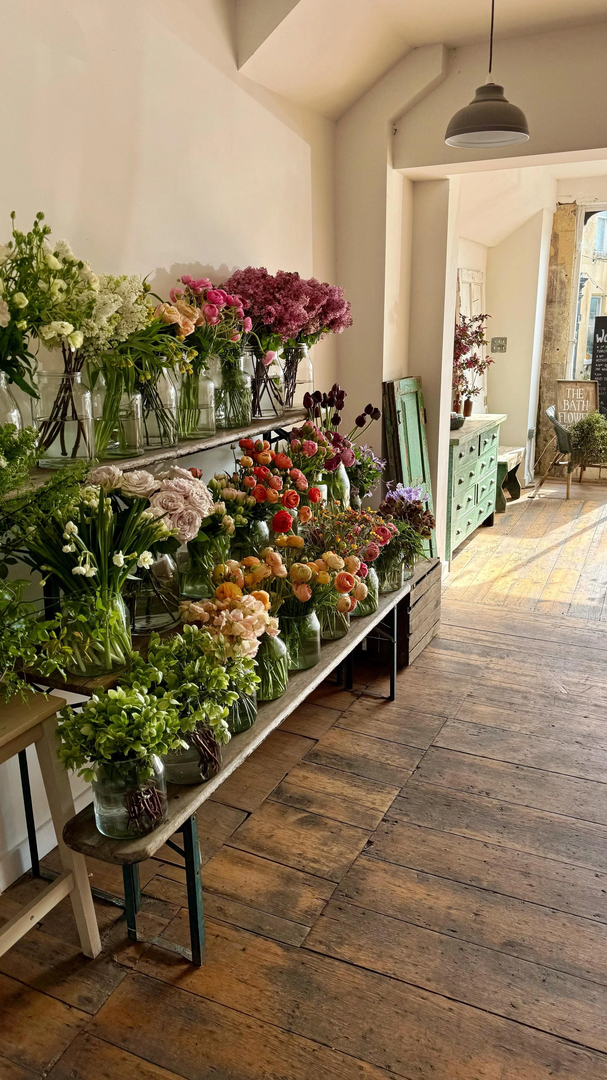 Our school, with its blank white walls, exposed Bath stone, stripped wooden floors, and a large front window, creates an inspiring space for both flowers and students.