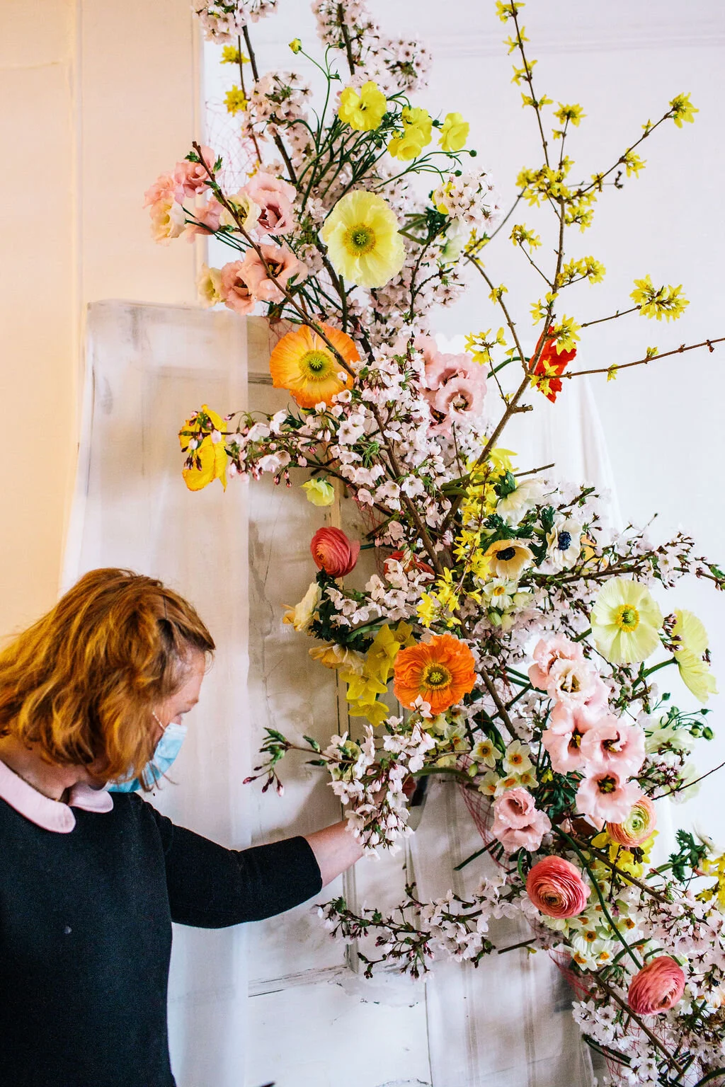 We were so lucky with the flowers that we chose for the installation. They were at their peak of perfection. We had Icelandic poppies, anemones, white cherry blossom, ranunculus, pale pink Lysianthus and two types of narcissi. Our floral installation was a draping of spring flowers held in place by a giant snake of chicken wire. Instead of trying to hide our mechanics, we decided to make a feature of it. We sprayed our chicken wire snake fluorescent pink which actually looked lovely on its own without any flowers in it!
